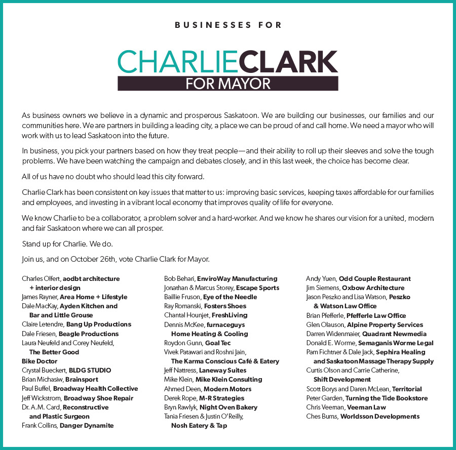 A full page StarPhoenix ad insertion listing the Saskatoon business owners who supported Charlie's candidacy and business tax plans.