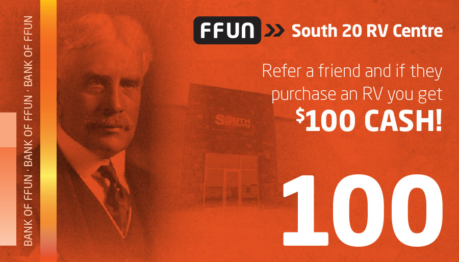 A handbill to promote this recreational vehicle dealership's referral program. Done to ape the look of a CAD $100 bill.